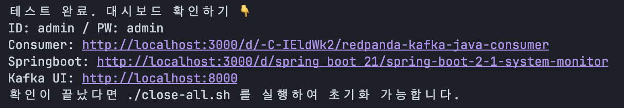 - Grafana는 3000, Prometheus는 9090, Kafka UI는 8000 포트를 사용합니다.